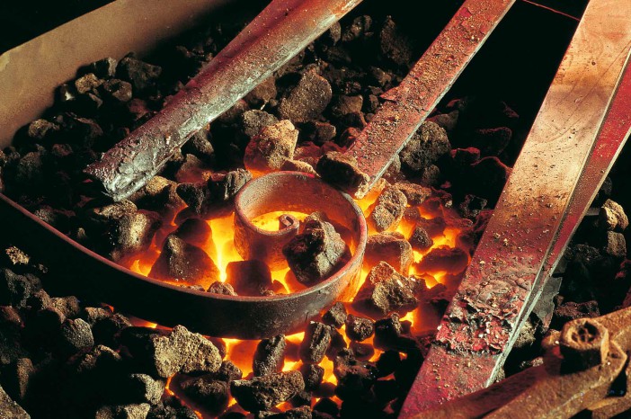 Tradicionalmente, el Hierro Forjado ha sido obtenido a partir del mineral de hierro calentado a altas temperaturas en una fragua . Luego, se procedía a golpearlo, en un proceso en el que se buscaba eliminar las impurezas y escorias contenidas en el mineral. |